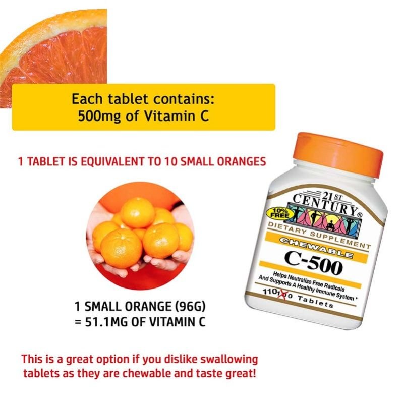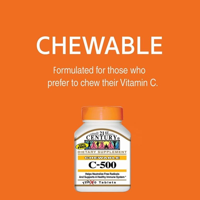21st Century C-500 Chewable Vitamin C Tablets For Antioxidant & Immunity Support is a quick and tasty way to help support your immune system as part of your daily wellness routine. This formula is an alternative for those who have difficulty swallowing large tablets or capsules. 21st Century C-500 Chewable Vitamin C Tablets are packed with 500mg Vitamin C per serving, which helps support your immune system as well as your body s antioxidant level. Vitamin C is an antioxidant nutrient that helps in building and boosting the immunity by eliminating the toxin from the body. Vitamin C, as a potent antioxidant, can prevent or slow cell damage caused by free radicals, hence preventing diseases. It also contributes to your immune defence system by supporting multiple cellular functions of your body s adaptive immune systems. Vitamin C helps encourage the production of white blood cells known as lymphocytes and phagocytes, which help protect the body against infection. Vitamin C helps these white blood cells function more effectively while protecting them from damage by potentially harmful free radicals. Free radicals are unstable molecules that the body produces as a reaction to environmental and other pressures. They can increase the risk of inflammation and various health issues. Free radicals, if not mopped up by the antioxidants, would cause inflammation, cancer, early ageing, and even heart disease. Vitamin C scavenges free radicals from the body cells, thus preventing or reducing the damage caused by oxidation. Our body depletes key nutrients faster as we age, so it’s important to have a wellness-focused lifestyle and diet along with added nutrients from 21st Century healthy antioxidant supplements. 21st Century has been supporting your wellness needs, and for over 30 years, the brand’s number one focus has been to provide you with the highest quality vitamins and nutritional supplements with the finest ingredients available.