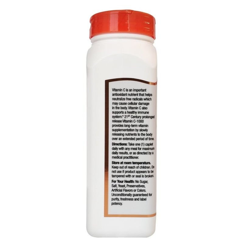 21st Century Vitamin C 1000 mg Prolonged Release Tablets help support your immune system longer-lastingly as part of your daily wellness routine. 21st Century Prolonged Release Vitamin C 1000 mg Tablets are packed with 1000mg Vitamin C per serving, which is slowly released in your body over an extended period of time to help support your immune system as well as your body s antioxidant level. Vitamin C is an antioxidant nutrient that helps in building and boosting the immunity by eliminating the toxin from the body. Vitamin C, as a potent antioxidant, can prevent or slow cell damage caused by free radicals, hence preventing diseases. It also contributes to your immune defence system by supporting multiple cellular functions of your body s adaptive immune systems. Vitamin C helps encourage the production of white blood cells known as lymphocytes and phagocytes, which help protect the body against infection. Vitamin C helps these white blood cells function more effectively while protecting them from damage by potentially harmful free radicals. Free radicals are unstable molecules that the body produces as a reaction to environmental and other pressures. They can increase the risk of inflammation and various health issues. Free radicals, if not mopped up by the antioxidants, would cause inflammation, cancer, early ageing, and even heart disease. Vitamin C scavenges free radicals from the body cells, thus preventing or reducing the damage caused by oxidation. Our body depletes key nutrients faster as we age, so it’s important to have a wellness-focused lifestyle and diet along with added nutrients from 21st Century healthy antioxidant supplements. 21st Century has been supporting your wellness needs, and for over 30 years, the brand’s number one focus has been to provide you with the highest quality vitamins and nutritional supplements with the finest ingredients available.