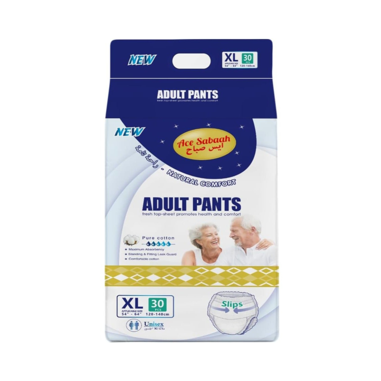 Ace Sabaah Super Dry Incontinence Unisex Briefs, Disposable and Highly Absorbent, Soft Feel, Size XXL, Waist (140 -160 cm), 64-74 Inches, Pack of 30 Adult Diaper Pants Ace Sabaah adult Diaper pant style diapers are easy to use by oneself. just like underwear, it can be easily pulled up and removed. these diapers are light and comfortable and have a good fit, preventing leakage. it helps you to stay active and be outgoing with confidence. Features Ace Sabaah Adult Diaper- Taped comes with a super absorbent gel core that quickly locks fluid away and fights bacteria. Adult Diapers ensure triple protection against odor, leak and moisture so that you can go about your day. New Ace Sabaah Adult Diaper provides up to 8 hours of protection against moderate urine leakage.