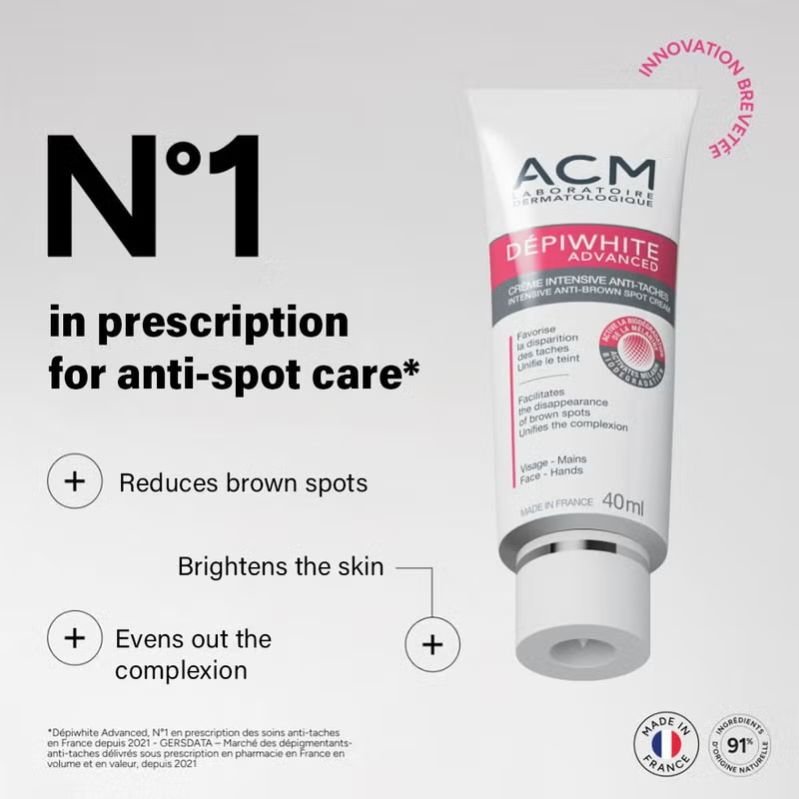 ACM Depiwhite Advanced Cream For Brown Spots is specially formulated to eliminate brown spots and limit their reappearance. It is enriched with high-performance depigmenting active ingredients for greater efficiency and to even out the complexion. Thanks to its combination of specific active substances, Depiwhite attenuates or eliminates brown spots, limits their reappearance and unifies the complexion by regulating the production of brown spot-forming melanin thanks to 3 synergistic actions, including reduction of melanin production, elimination of existing epidermal melanin and stimulation of melanin biodegradation. The Depiwhite product range is intended for individuals—most frequently women—suffering from hyperpigmentation such as senile or actinic lentigo, melasma or chloasma. Thanks to a complete range of Depiwhite depigmenting care products, which are adapted to the various epidermal hyperpigmentation locations.