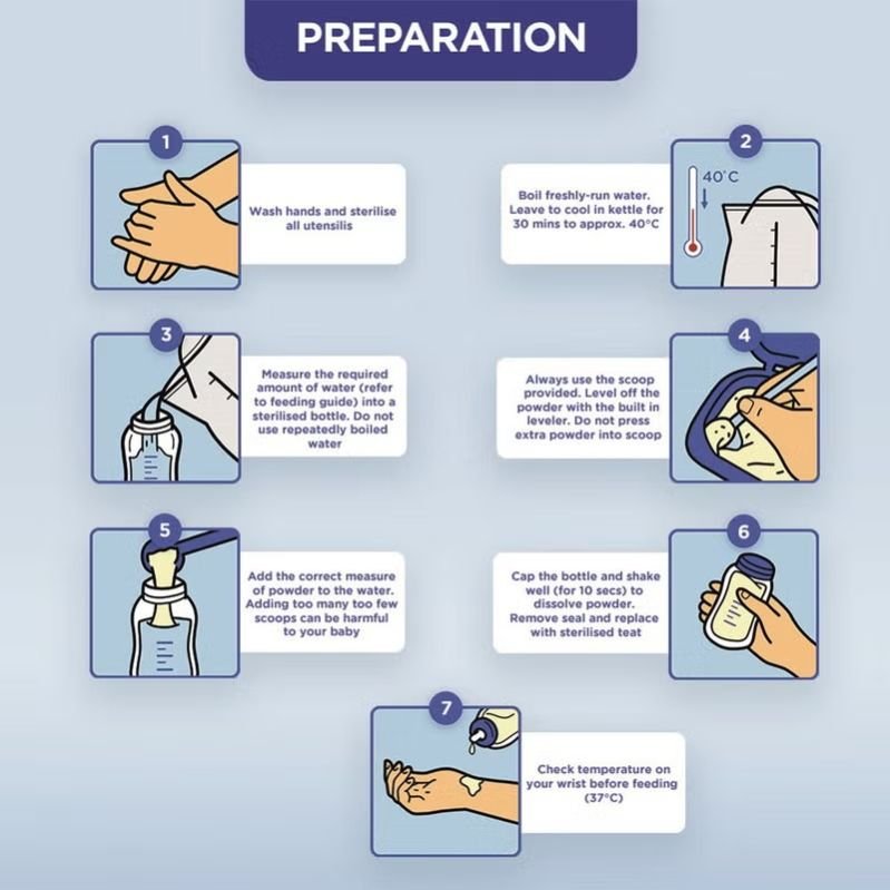 - To prepare: Wash hands and sterilize all utensils. Boil fresh water. Leave to cool in the kettle for 30 min. Measure the required amount of water (refer to the product feeding guide) into a sterilized bottle. Do not use repeatedly boiled water. Always use the scoop provided. Level off the powder with the back of a knife. Do not press extra powder into the scoop. Add the correct measure of powder to the water. Adding too many or too few scoops can be harmful to your baby. Cap the bottle and shake well (for 10 seconds) to dissolve the powder. Remove the seal and replace it with a sterilized teat. Check the temperature on your wrist before feeding (37.5 degrees Celsius).