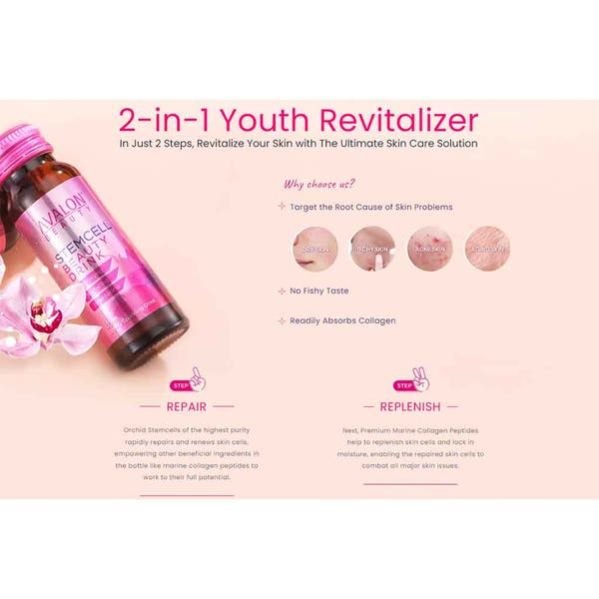 Avalon® Stemcell Beauty Drink is a comprehensive skincare solution that uses high-quality stem cells from young orchids to rejuvenate skin and reduce aging. It promotes collagen retention, moisture retention, and skin elasticity and is Halal-certified for long-term consumption.