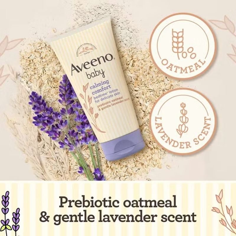 Aveeno Baby Calming Comfort Bedtime Lotion For Delicate Skin is a clinically proven, non-greasy formula that hydrates and protects baby s delicate skin for 24 hours, containing high-quality prebiotic oatmeal and a gentle lavender scent.