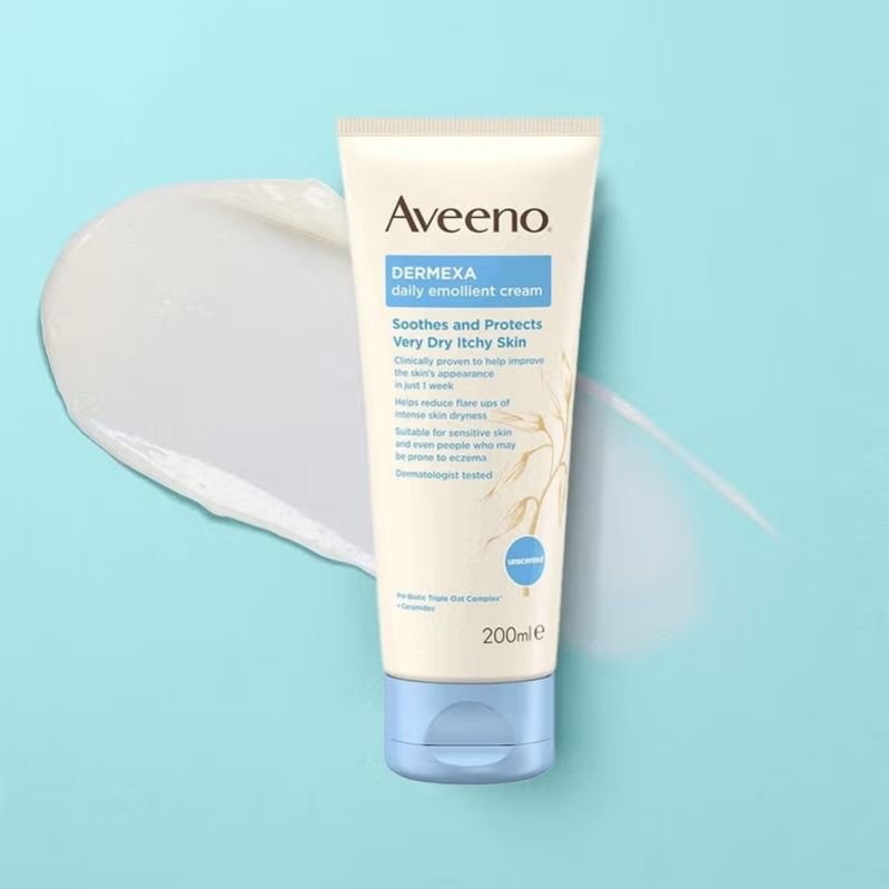 Aveeno Dermexa Daily Emollient Cream soothes atopic allergies with prebiotic oat complex and ceramides, improving skin microbiome balance for healthy, resilient skin.