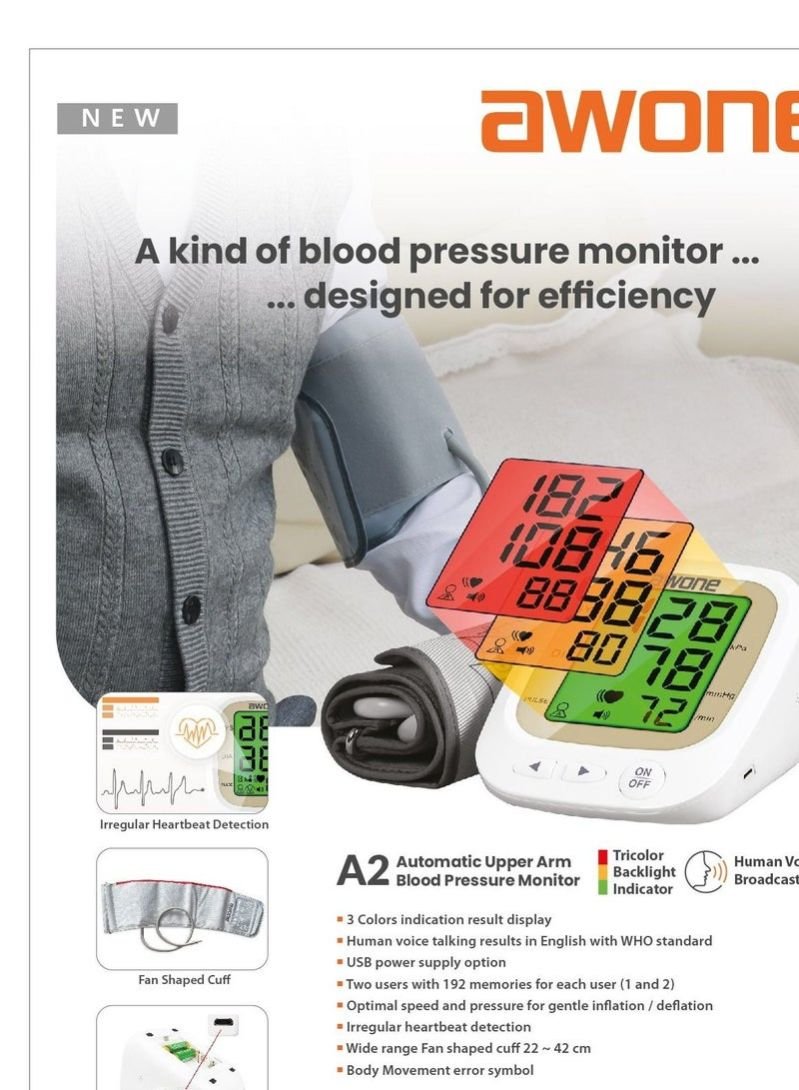 The Awone A2 Automatic Upper Arm Blood Pressure Monitor is a compact, user-friendly device for accurate monitoring of blood pressure and pulse rate, aiding in maintaining cardiovascular health.