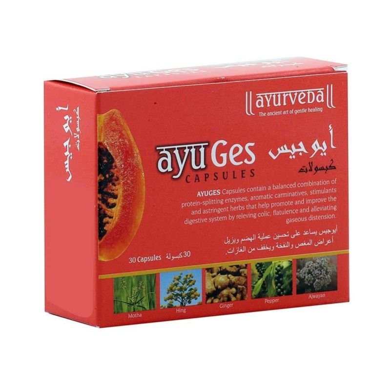 Ayurveda Ayuges Capsules 30’s is an Ayurvedic herbal supplement designed to support digestive health and alleviate gastrointestinal discomfort. Formulated with a blend of natural ingredients such as motha, hing, ginger, pepper, and ajwain, these capsules help relieve colic, flatulence, and gaseous distension. Regular use may improve digestion, enhance appetite, and provide relief from indigestion symptoms, including heartburn and stomach pain.