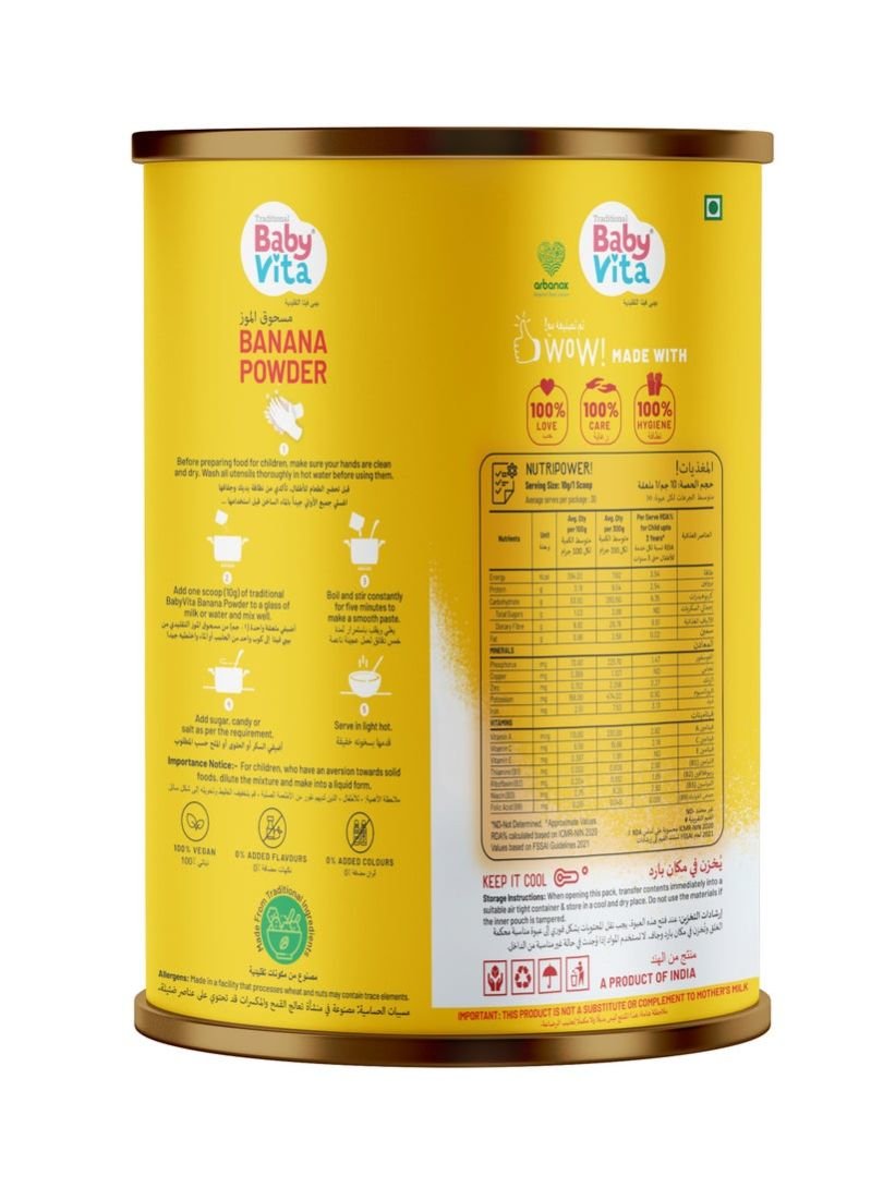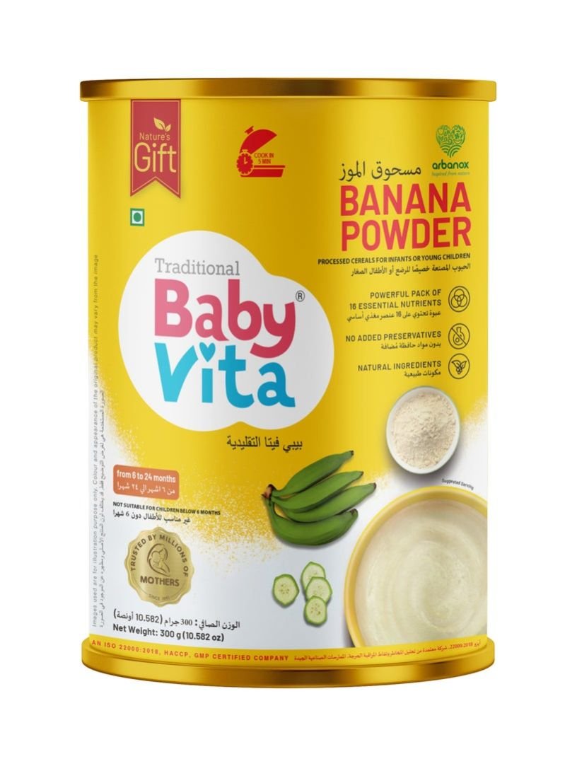 BabyVita Banana Powder is formulated specifically for babies, offering a safe, nutritious, and delicious meal option for early childhood nutrition.