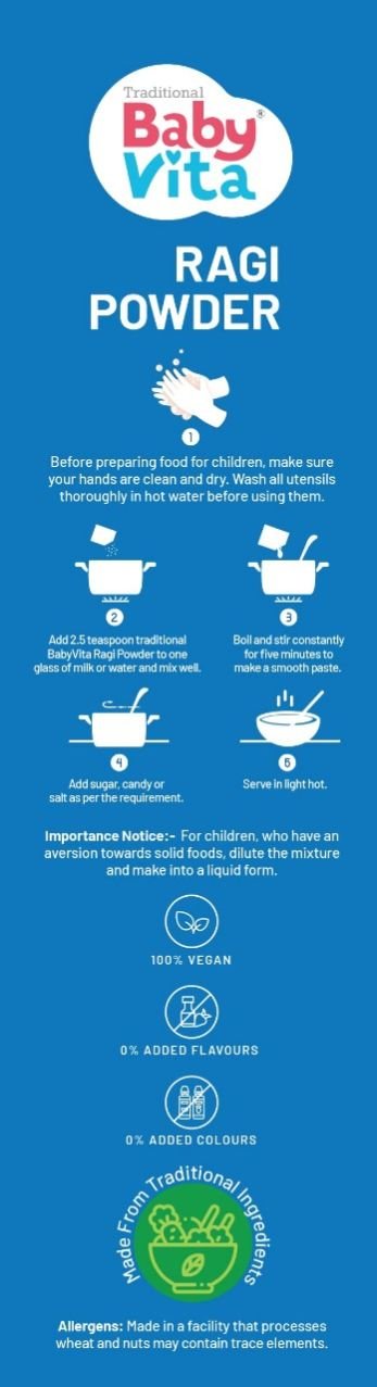 BabyVita Ragi Powder is specially formulated for babies, providing a safe, wholesome, and nutritious meal option for early childhood.