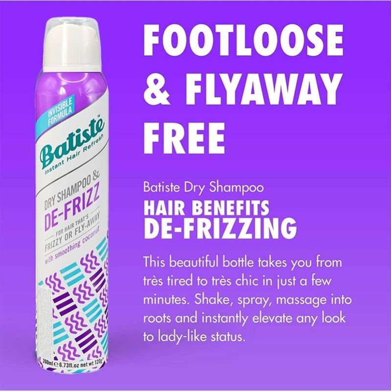Batiste Instant Hair Refresh Dry Shampoo De-Frizz is a breakthrough formula, with smoothing coconut, that will refresh your hair and smooth out the frizz. It is invisible and feels super lightweight on your hair. Dry Shampoo and De-Frizz will work on any hair type, but they re perfect for hair that s frizzy or flyaway. De-Frizz dry shampoo will refresh your hair and protect it against damage caused by heat styling. For maximum de-frizz action, spray all over and work through. There are many times that your hair would feel dull and oily. But you wouldn t have the time to wash your hair. This is where Batiste Instant Hair Refresh Dry Shampoo comes to the rescue. This dry shampoo will give your hair an instant refreshed feel and remove excess oil buildup without soap or water. This quick hair fix absorbs extra oil and provides your hair with instant volume. Use between washes to instantly refresh your hair; no water is required. Batiste Dry Shampoo cleanses the oil in the roots so that hair looks clean and fresh with added body and texture. It is a perfect quick fix for great-looking and great-smelling hair in between washes.