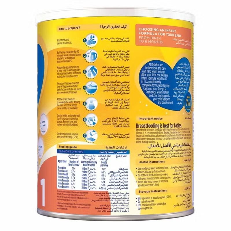 Bebelac Nutri 7 In 1 Stage 1 Infant Milk Formula For 0-6 Months Baby is a comprehensive formula that provides essential nutrients for a baby s growth and development. It contains calcium, iron, omega-3, prebiotics, vitamin C, vitamin D, and zinc. This formula is gentle on the tummy and supports the child s growth and development needs. It is a suitable substitute for human milk, providing the full nutritional needs of babies from birth to 6 months. The exclusive blend of nutrients supports the baby s overall growth and development, making it suitable for both breastfeeding and as part of a starter diet.