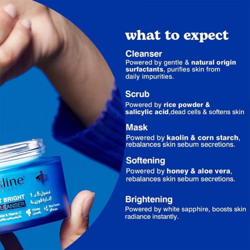 - For optimal results: For dry to normal skin: Use Beesline 5 In 1 Instant Bright Cleanser once per day as a scrubbing cleanser. Apply to damp skin, massage gently in circular motions, and then rinse.