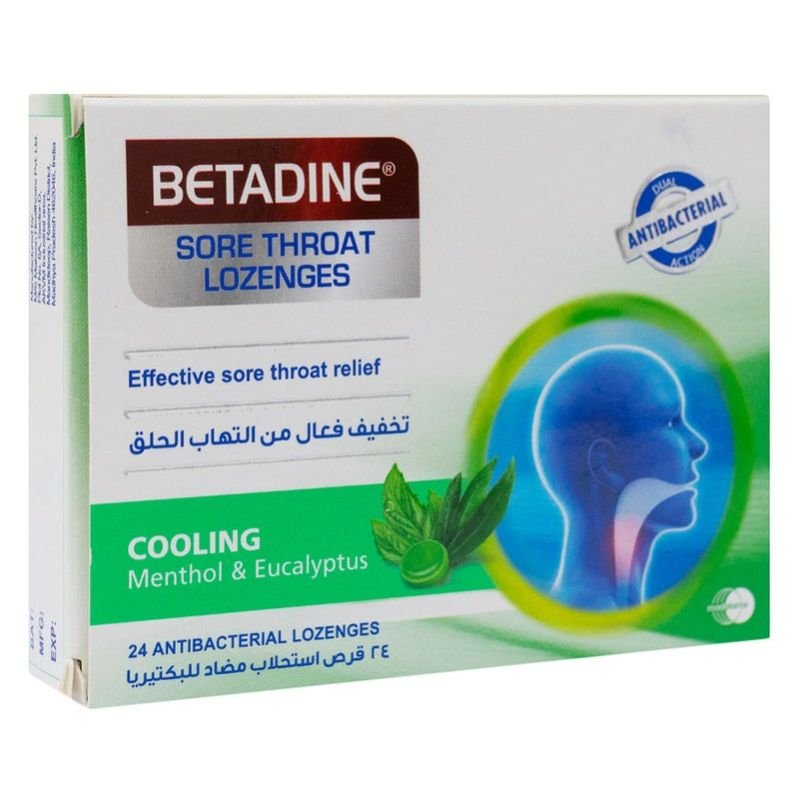 - Dissolve 1 Betadine Sore Throat Antibacterial Lozenges With Cooling Menthol & Eucalyptus slowly in the mouth, every 2 to 3 hours, as required. Maximum 12 lozenges per day. Try using Betadine Ready To Use Sore Throat Gargle 120 mL to treat sore throats, along with Betadine Sore Throat lozenges to relieve sore throat symptoms. Always read the label. Follow the directions for use. If symptoms persist, talk to your health professional.