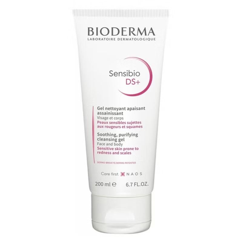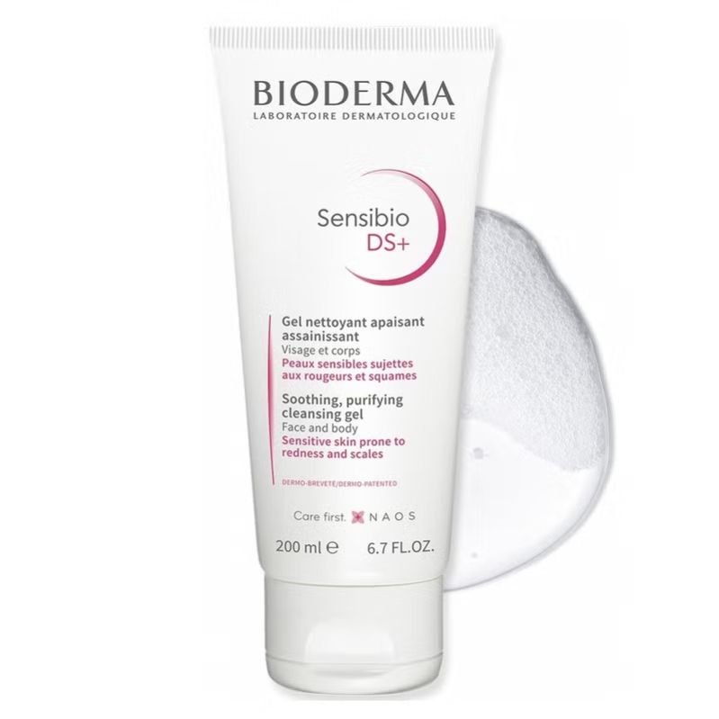 Bioderma Sensibio DS+ Cleansing Gel addresses redness and scales by reducing Malassezia yeast proliferation and irritants, purifying the skin, and reducing scale formation.