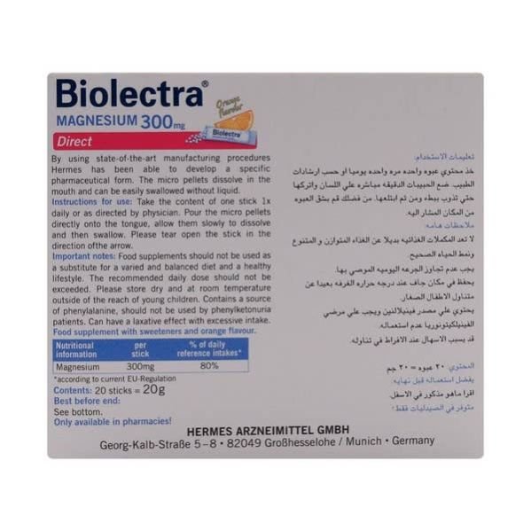 Biolectra Magnesium Direct is a modern high-dosage magnesium for every person s health and beauty, for normal pregnancy, birth, and development of a healthy child. It is a biologically active food supplement. Indicated in irritability, sleep disorders, headaches, stress, menopause, premenstrual syndrome, painful periods, abdominal cramping, constipation, cramps in the legs, as well as other activities, athletics, abusive drinking behavior, keeping a diet, irregular meals, taking certain medications such as diuretics, contraceptives.