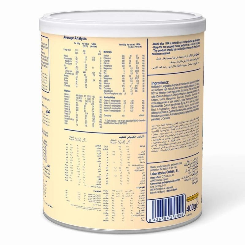 Blemil Plus 1 HR is a formula for infants allergic to cow's milk protein. It fully meets their nutritional needs from birth up to 6 months of age. Blemil Plus 1 HR is made from partially hydrolyzed rice proteins with an amino acid profile like that of breast milk, which improves its digestibility and minimizes allergenicity. Its nucleotide content contributes to the maturation of the infant’s immune and digestive systems, thus ensuring the baby’s optimal growth and development. Blemil plus 1 HR contains 100% plant-origin fats like medium-chain triglycerides (MCTs). Palmitic acid in the β position that facilitates soft and easy-to-eliminate stools and increases the absorption of fatty acids and minerals such as calcium and magnesium. Blemil plus 1 HR is rich in zinc, calcium, iron, and 13 vitamins, including vitamin D for boosting the immune system. Blemil Plus 1 HR is lactose-free, sucrose-free, and soy-free. Blemil Plus 1 HR is a formula that is recommended for: Treatment of allergies and intolerance to cow's milk protein, Prevention of allergies in children with a family history of allergies, Feeding again following gastrointestinal disorders and malabsorption of vegetarian diets. NOTE: Breast milk is the ideal food for the infant during the first months of life, as it provides all the nutrients and immune agents it needs for its proper development. In the event that this is not possible or is insufficient, starter milks are an optimal alternative for infant feeding from the first day. Consult with your pediatrician to determine the type of milk most suitable for your baby.