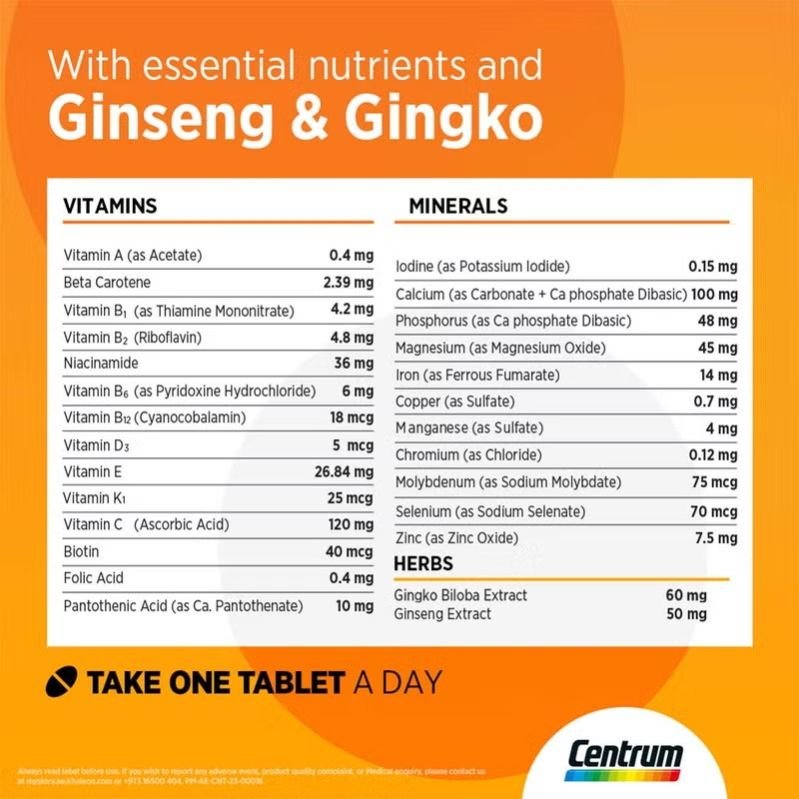 Centrum Energy is a daily multivitamin with ginseng to support physical performance to suit an active lifestyle. Centrum Performance Energy includes pantothenic acid and Ginkgo Biloba, which help maintain an active mind, and zinc, which contributes to the maintenance of normal bones. In addition, vitamins B6 and B12 help unlock energy from your diet. Centrum Energy contains a special micronutrient formula supplemented with ginseng & ginkgo biloba extracts to support the needs of adults with active lifestyles.