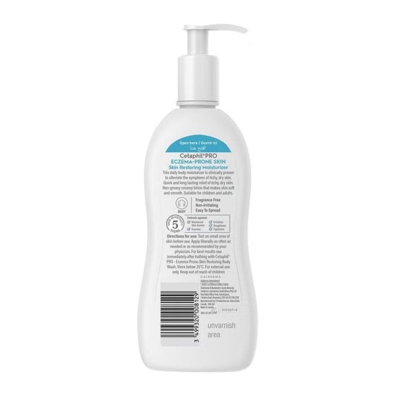 Cetaphil PRO Eczema-Prone Skin Restoring Body Moisturizer For very dry, itchy skin, it gives restorative moisture to the skin. It is clinically proven to alleviate the symptoms of itchy, dry skin. This soothing lotion protects skin and helps relieve itchy skin, while the ceramide and filaggrin blend helps to restore the skin s natural moisture barrier and improve the skin’s ability to retain hydration over time. The gentle, creamy, non-greasy lotion absorbs quickly to leave skin feeling soothed and hydrated for up to 24 hours. Cetaphil PRO Eczema-Prone Skin Body Lotion defends against 5 signs of skin sensitivity, including dryness, irritation, roughness, tightness and a weakened skin barrier. This creamy lotion hydrates the skin and locks in moisture, helping to strengthen and protect skin. The non-greasy formula absorbs quickly to instantly soothe the discomfort caused by dry itchy skin. The soothing body wash and Moisturizer products have been approved by the Allergy Foundation South Africa.