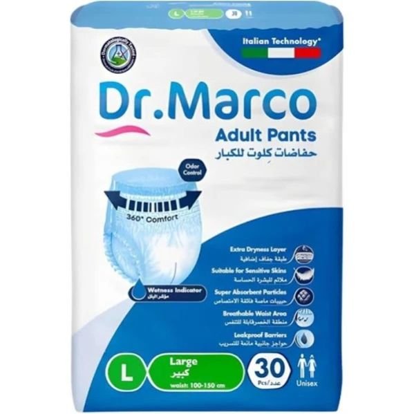 Dr. Marco Adult Diaper is a high-quality incontinence product designed for maximum comfort and protection. This package includes 30 count large size culotte pants that are suitable for individuals with a waist size of 120-170cm. Made in Turkey with Italian technology, this product is highly absorbent and features a soft material that is gentle on the skin.