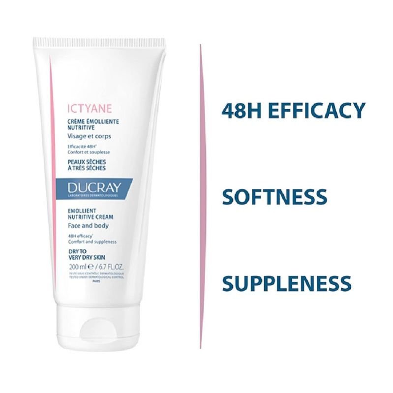 Ducray Ictyane Emollient Nutritive Cream For Face & Body is an iconic treatment that has been passed down from generation to generation to take care of dry to very dry skin every day. Its velvety texture that melts on the skin and its pleasant scent with delicate floral notes instantly provide a cocooning feeling. Intensely hydrated and nourished, the skin regains all its suppleness and comfort thanks to a duo of active ingredients: Acefylline and Abyssinian Oil. The ICTYANE Nutritive emollient cream leaves a protective film on the surface of the skin to protect it from drying out and provide comfort for 48 hours.