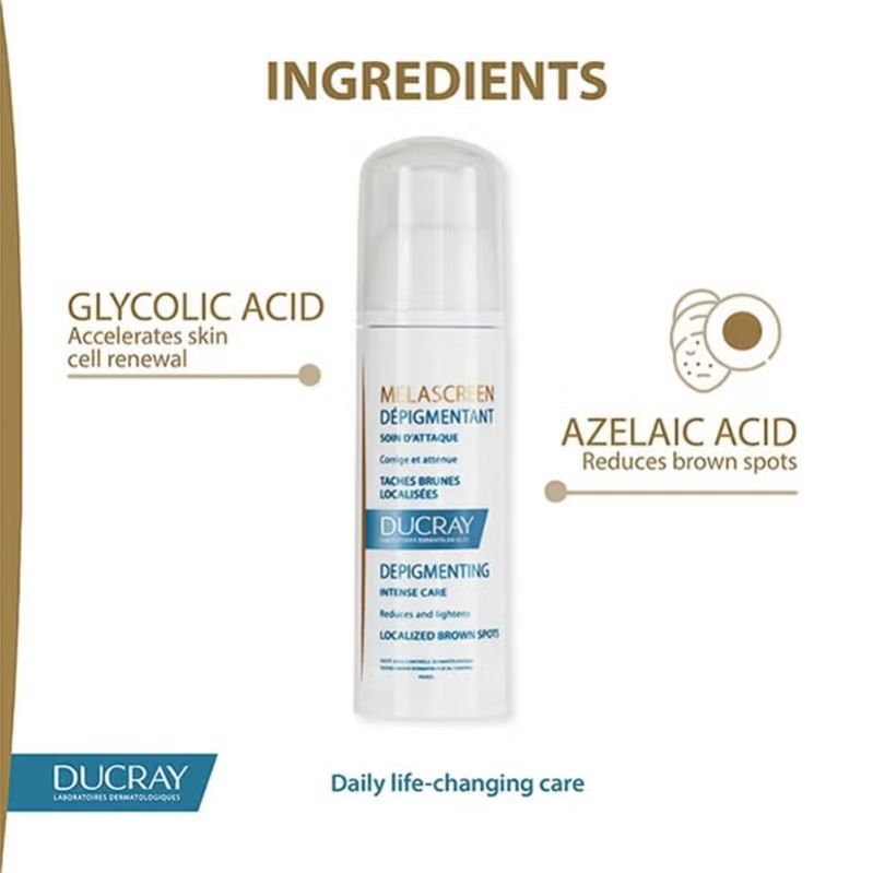 Ducray Melascreen Depigmenting Intense Care is concentrated in de pigmenting actives with azeleic acid and glycolic acid. It can be applied topically for targeted efficacy on pigmentation flaws.