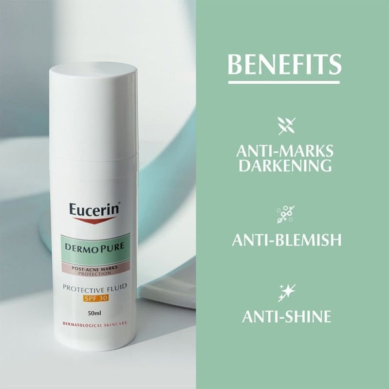 - Thoroughly cleanse skin before use. Apply one full pump of Eucerin Dermo Purifyer Post Blemish Anti-Mark SPF 30 Protective Fluid thoroughly all over your face and avoid the eye area. Use in the morning or as often as needed. Use in combination with Eucerin DermoPure Triple Effect Serum for enhanced efficacy.