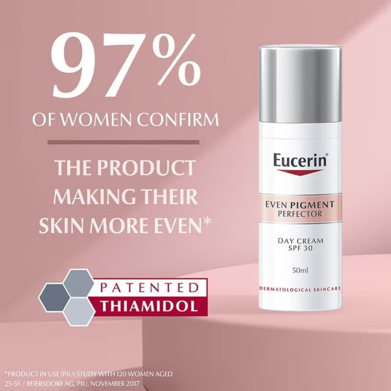 Eucerin Even Pigment Perfector SPF30 Day Cream For Dark Spots is a moisturising day cream with UVA and UVB protection for even, radiant skin. Melanin is a natural pigment that gives colour to the skin. Increased melanin production and hyperpigmentation can be caused by exposure to sunshine, hormonal effects, and ageing. Hyperpigmentation causes uneven skin by appearing as dark patches and ageing spots (also known as sunspots). Eucerin Even Pigment Perfector Day SPF 30 contains Thiamidol, an effective and patented ingredient that acts at the root cause of hyperpigmentation by reducing melanin production. It is clinically and dermatologically proven to reduce dark spots and prevent their reappearance. First results are visible after two weeks and improve continuously with regular use. Formulated with SPF 30 with UVA and UVB filters, the moisturising day cream offers effective protection from the sun and reduces the chances of your skin developing sun-induced pigment spots. Leaves your skin with an even tone and radiant look. Even the Pigment Perfector range has been specially formulated with our patented ingredient, Thiamidol, to effectively reduce hyperpigmentation for more even and radiant skin. This day face cream for pigmentation is clinically and dermatologically proven to show very good skin tolerability and effectiveness on all skin types. It helps achieve a more even and radiant-looking skin when used regularly. Beauty doesn t have to be complicated. It just needs to work. After all, your skin is the body s largest organ, and it deserves good care, too. That s why Eucerin is trusted by dermatologists, recommended by pharmacists, and loved by consumers worldwide as the brand that delivers healthy, beautiful skin for everyone. Discover the life-changing power of Eucerin s dermatological skincare products, from moisturisers and sunscreens to foot care products and more.