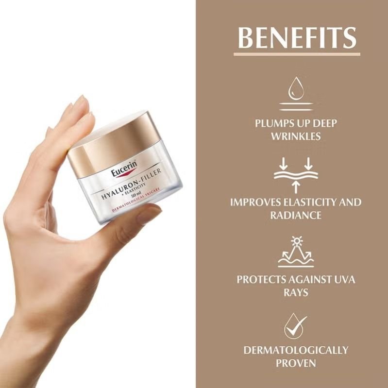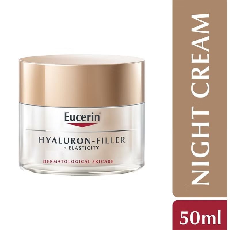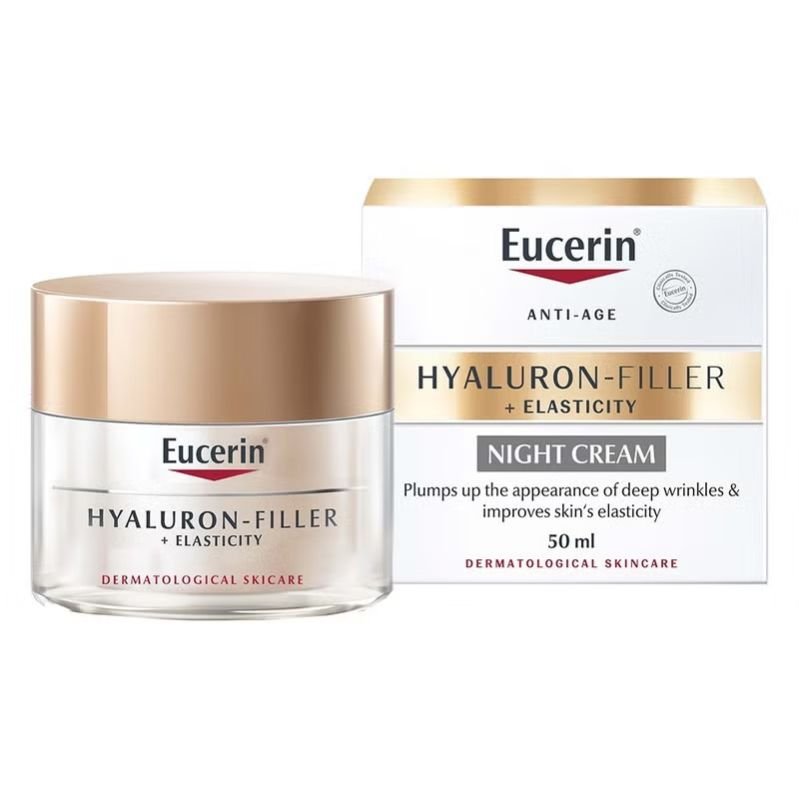 Eucerin Hyaluron-Filler + Elasticity Night Cream is an anti-ageing night cream that plumps up deep wrinkles and improves skin s elasticity. The unique formula delivers multiple anti-ageing benefits. Eucerin s innovative blend of both high and low molecular Hyaluronic Acid visibly plumps deep wrinkles. Arctiin (an active ingredient proven to accelerate collagen renewal in skin cells) works alongside Silymarin (a powerful antioxidant that protects collagen and elastin from degrading and improves skin circulation at a cellular level). Skin feels firm and smooth and looks fresh and radiant. Eucerin Hyaluron-Filler + Elasticity Night also includes Argan Oil. Rich in skin-caring lipids, this supports regeneration and smooths skin s surface overnight. Beauty doesn t have to be complicated. It just needs to work. After all, your skin is the body s largest organ, and it deserves good care, too. That s why Eucerin is trusted by dermatologists, recommended by pharmacists, and loved by consumers worldwide as the brand that delivers healthy, beautiful skin for everyone. Discover the life-changing power of Eucerin s dermatological skincare products, from moisturisers and sunscreens to foot care products and more.