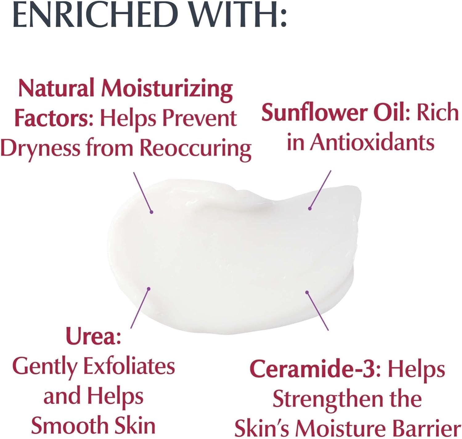 Eucerin Roughness Relief body cream intensively hydrates dry skin, retaining moisture for 48 hours, and is enriched with Urea, Ceramide 3, and Sunflower Seed Oil.