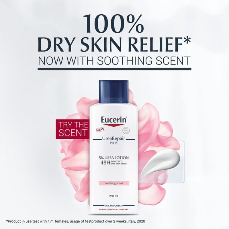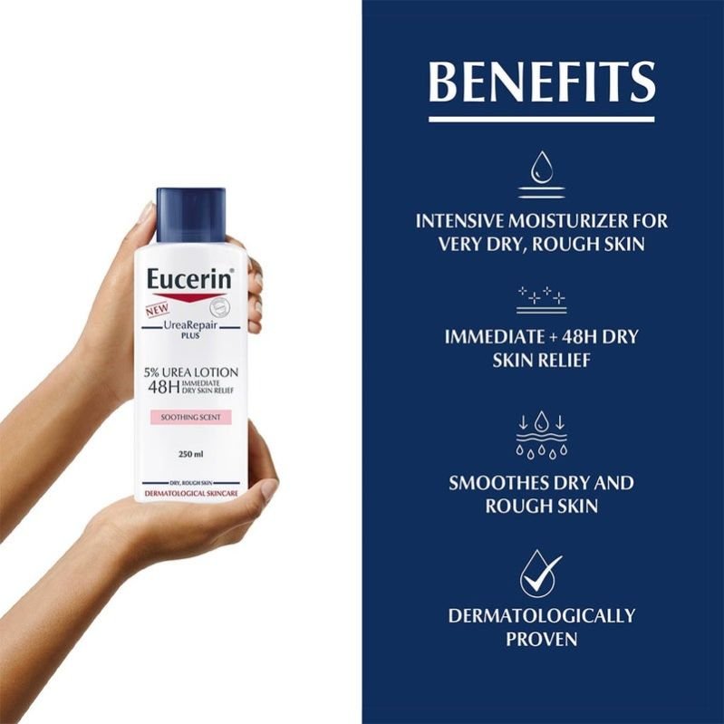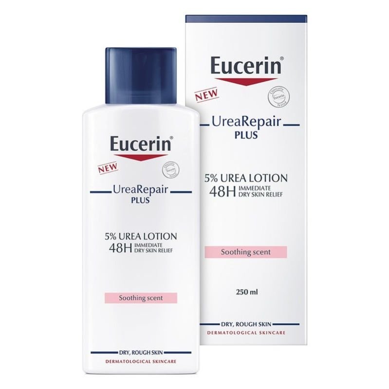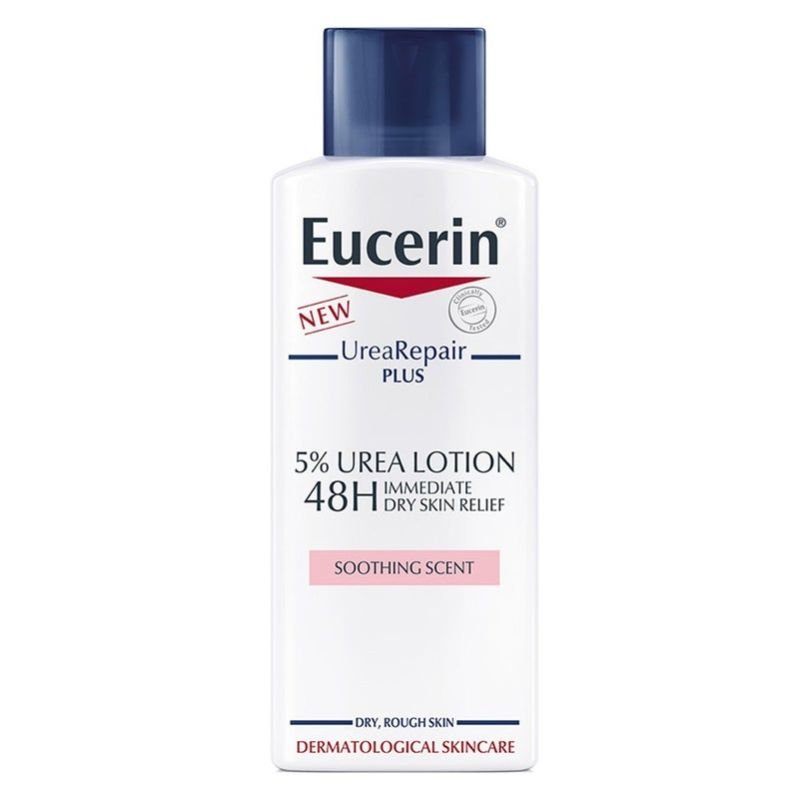 Eucerin UreaRepair PLUS 5% Urea Lotion With Soothing Scent For 48h Dry & Rough Skin Relief gives very dry, rough body skin the daily care it needs. It contains a unique combination of ingredients - Urea, Ceramide and other Natural Moisturizing Factors (NMFs)—which bind moisture in and repair skin s natural protective barrier to prevent further moisture loss. The main active ingredient is Urea: the ‘gold standard’ for dry skin treatment. Urea is a humectant (meaning it attracts water to the skin). It also increases the water-binding capacity of the skin and helps to maintain its barrier function. This improves elasticity and protects against moisture loss (known as transepidermal water loss, or TEWL). The Eucerin UreaRepair PLUS complex combines Urea with Ceramides, Gluco-Glycerol and other NMFs that support Urea’s efficacy. Skin-identical Ceramides forms a protective lipid envelope to protect the outer layers of skin and enhance barrier function, while Gluco-Glycerol improves the distribution of water in deeper epidermal layers, thereby hydrating skin from the inside out. This combination of moisturising and lipid-replenishing ingredients provides excellent support for dry skin. The formula has been clinically and dermatologically proven to deliver immediate relief and intense, long-lasting moisturization, delaying dryness and roughness for up to 48 hours. Skin is intensely moisturised and looks and feels smooth and supple again. The lotion is suitable for mature skin and those with Diabetes, Psoriasis and Keratosis Pilaris. It can also be used as adjunctive care.