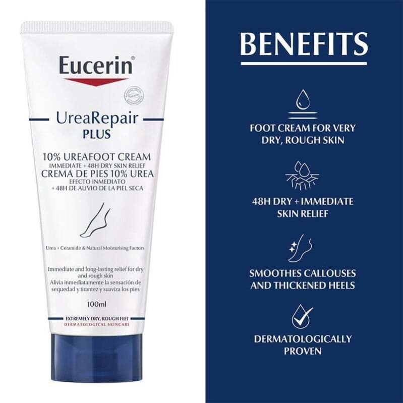 Eucerin Urea Repair Plus 10% Urea Intensive Foot Repair Cream gives very dry, rough feet the intense moisturization they need. It contains a unique combination of ingredients - Urea, Ceramide and other Natural Moisturizing Factors (NMFs)—which bind moisture in and repair skin s natural protective barrier to prevent further moisture loss. The skin on the soles of our feet has developed to be naturally thicker and harder than skin elsewhere on the body and is particularly susceptible to dryness. Feet are often subjected to the pressures and friction that come from hard surfaces or inappropriate footwear, and these stresses can cause them, especially the heel pads, to dry out further. Eucerin Urea Repair Plus has been clinically and dermatologically proven to deliver immediate relief and intense, long-lasting moisturization, delaying dryness and roughness for up to 48 hours. The active ingredients Urea helps improve hydration and makes the skin smoother, while Ceramides help retain skin moisture, and Natural Moisturizing Factors or NMFs, bind moisture in the skin to prevent it from drying out further. It works quickly to relieve dryness and discomfort and leaves feet feeling smooth and soft. Skin feels smooth again, and thickened skin and calluses are reduced. The foot cream is suitable for those with mature skin and skin conditions such as Xerosis, Diabetes and Psoriasis. It can also be used for adjunctive care. Eucerin’s UreaRepair Plus offers a comprehensive range of products to tackle problem areas of extremely dry skin, such as skin tightness, itchiness, scaling, flakiness, redness, and Xerosis.