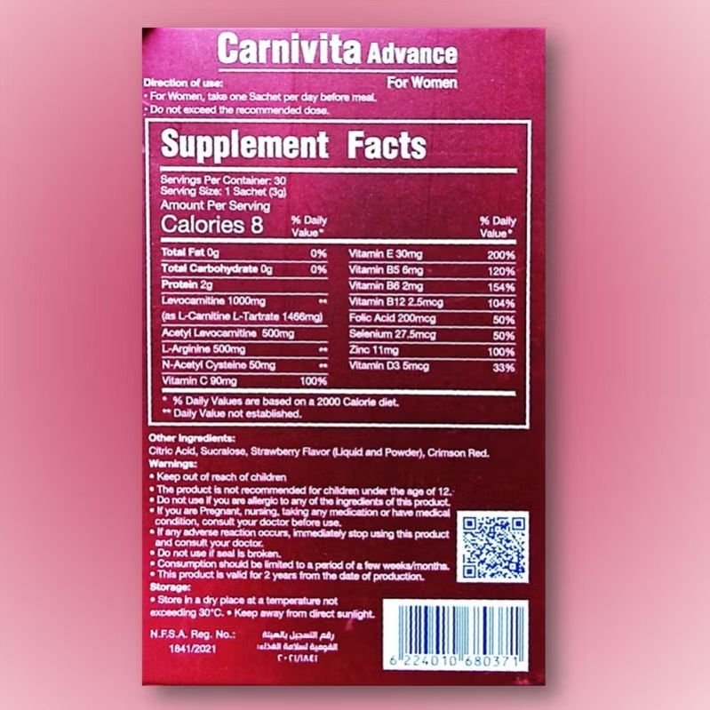 Eva Pharma Carnivita Advance Oral Powder Sachets For Women contains 13 active ingredients, including L-carnitine and antioxidants, which support energy metabolism, fertility, muscle strength, egg quality, and menstrual cycles.