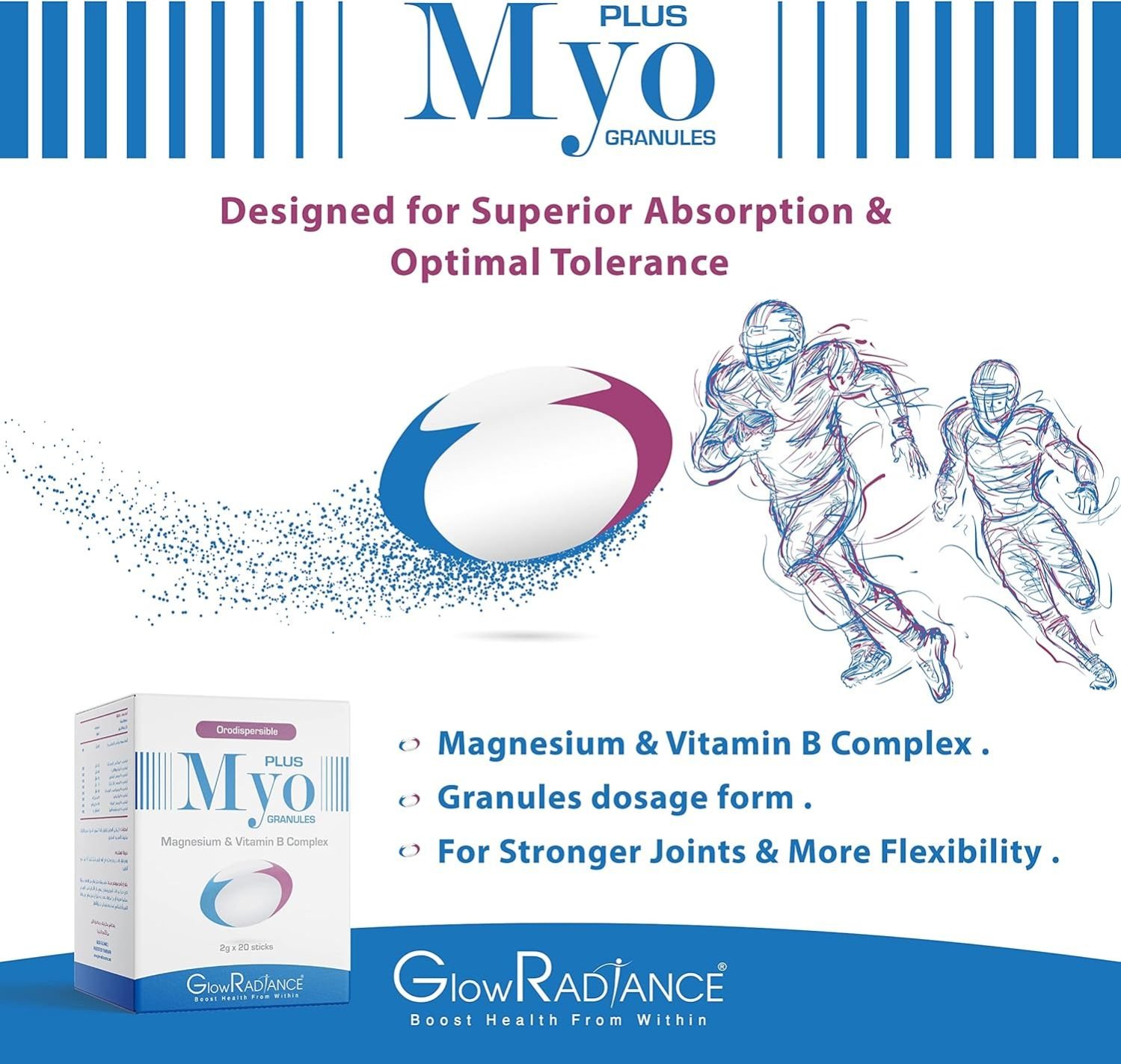 GlowRadiance Myo Plus Granules Magnesium & Vitamin B Complex is a premium dietary supplement that supports energy production, nerve function, and overall vitality in 2g sticks.