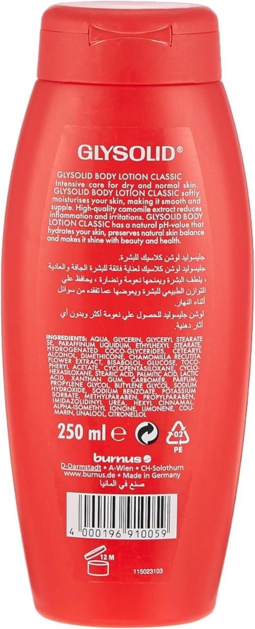 Glysolid Body Lotion 250 is an intensive care for dry and normal skin. It softly moisturizes the skin, making it smooth and supple. High quality chamomile extract that reduces inflammation and irritations.