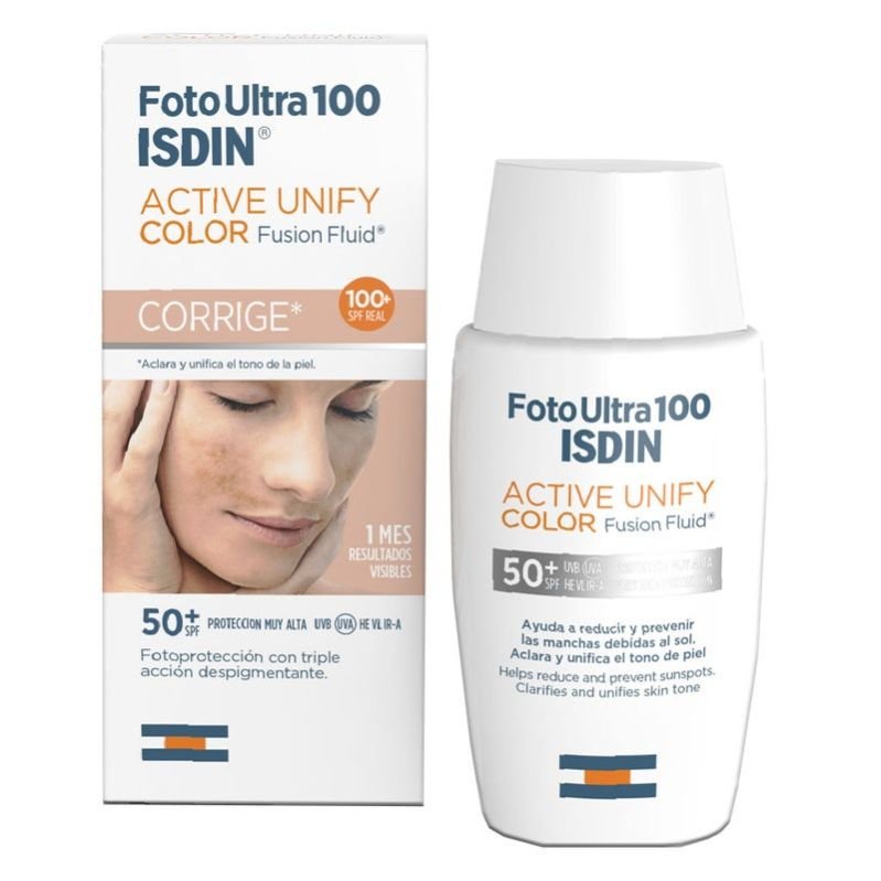 Isdn fotoultra 100 active unify SPF50+ is a fluid with whitening action, with SPF 106 and UVA in vitro 49, that lightens and unifies skin tone. Helps reduce pigmentation spots caused by the sun thanks to its DP3-Unify complex, with whitening action that reduces the pigmentation caused by the sun.