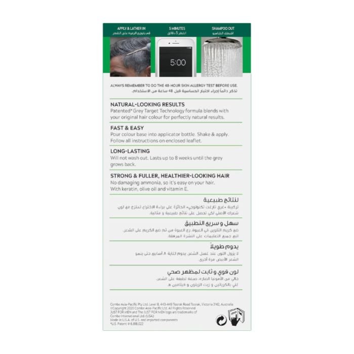 Just for Men targets only the grey hair. Replaces it with subtle tones that match your natural hair colour.