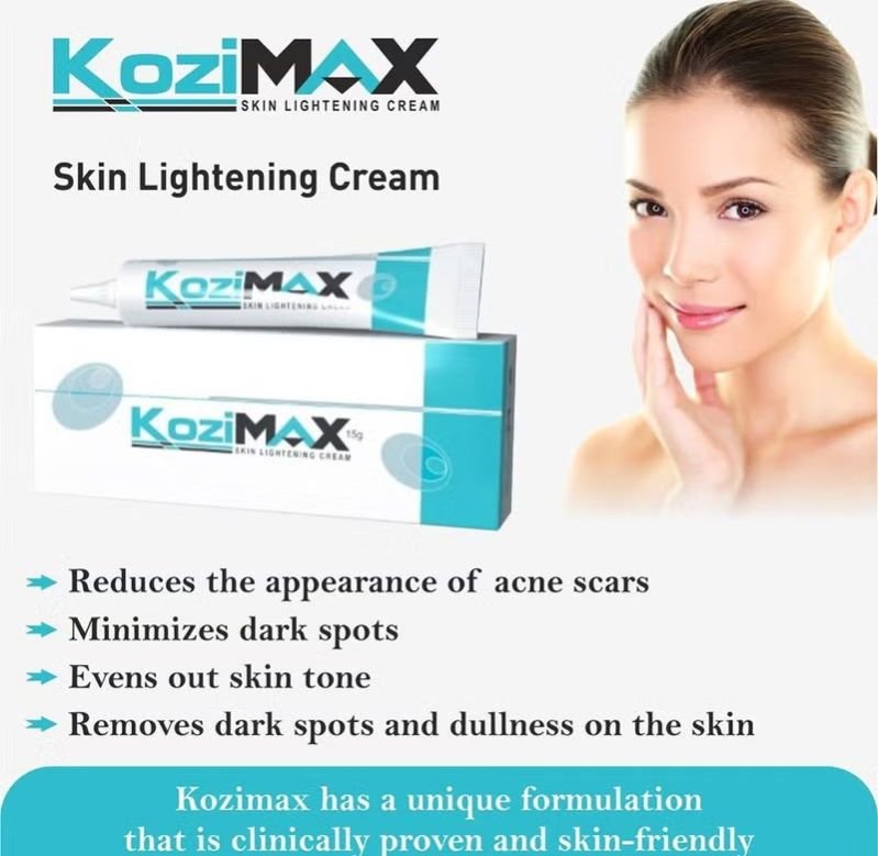 Information Combination of Kojic acid and Vitamin C Skin lightening teatment 15 g tube packing Description Kozimax Skin Lightening cream help to improve fairness of face. This cream brings revolution in skin lightning treatments. With the combination of 5% of Kojic acid and 10% of Vitamin�C (In stable form) keeps Kozimax unique. Arbutin add extra skin lightning effects. Kozimax contains Glabridin in its purest form.