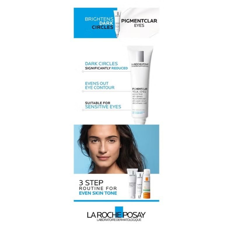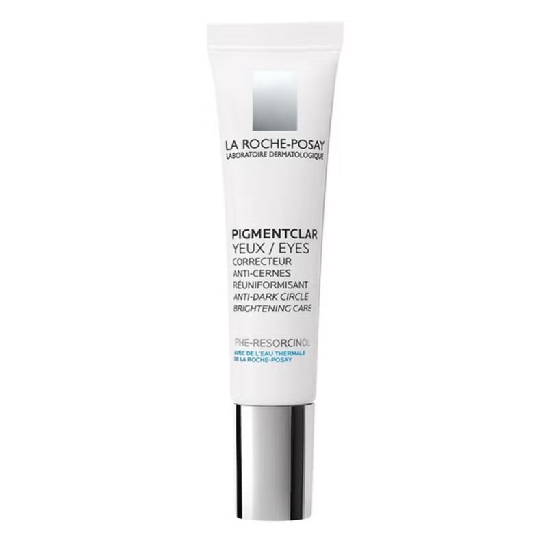La Roche-Posay Pigmentclar Eyes is a formula that regulates melanogenesis, reduces dark brown and blue under-eye circles, and includes PhE-Resorcinol + Caffeine, glycerin, dimethicone, silica, iron oxides, and light-reflecting pigments.