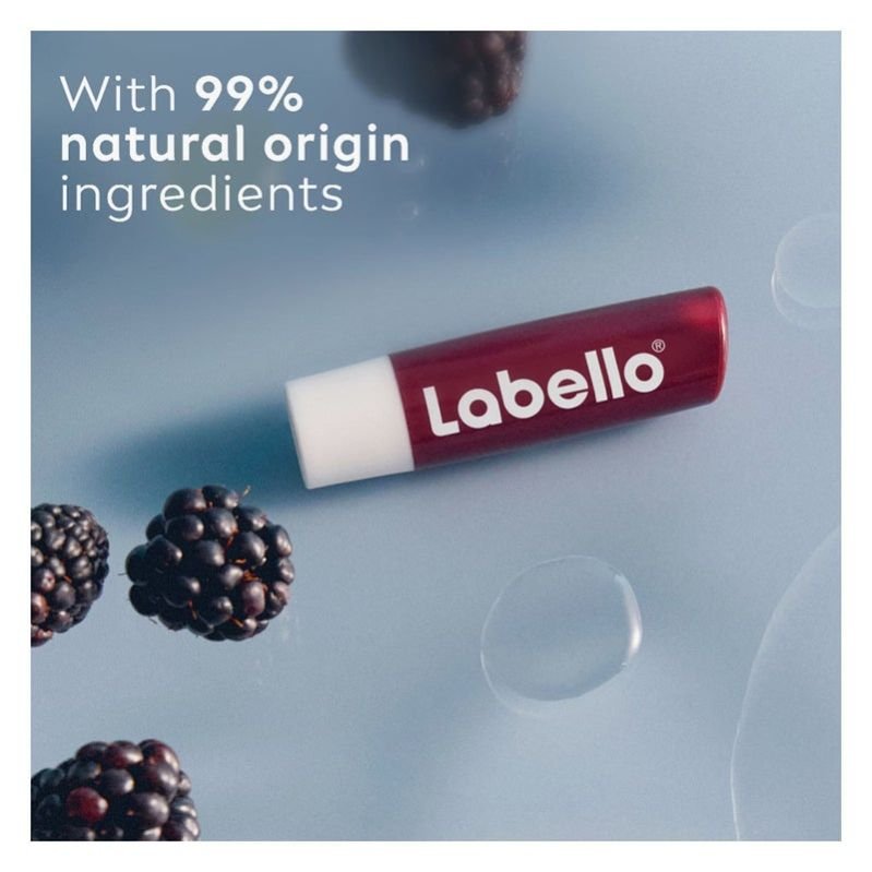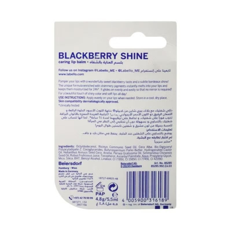 Labello Blackberry Shine Lip Balm provides 24 hour melt-in moisture, a sweet blackberry taste, and subtle bordeaux shine, enriched with shimmery pigments and mineral oil-free.