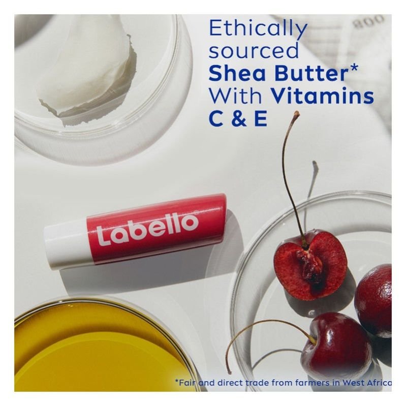 Get long-lasting moisture and pretty-looking lips with Labello Cherry Shine Lip Balm. Its rich formula features 24-hour melt-in moisture that not only keeps your lips from drying out but also leaves them feeling smooth and supple all day. The delicious fruity cherry aroma adds a touch of ruby red shine to leave your lips looking soft, glossy, and pretty. Enriched with skin-loving ingredients like shea butter and natural oils infused with vitamins, our moisturising lip balm instantly melts into lips, leaving them sensationally soft and effectively protected against cold, wind, and dry air. Dermatologically approved and suitable for all skin types, this long-lasting lip balm glides evenly and easily, so you don’t need to depend on a mirror for every application. Crafted with nothing but natural ingredients and no mineral oil, it’s the perfect daily lip balm to instantly moisturise your lips and leave them looking soft, smooth, and shiny with a hint of cherry red. 97% of women confirmed that this tinted lip balm beautified their lips. From Strawberry, Pomegranate, and Peach to Blackberry and Aloe Vera, Labello Lip Balm is available in other fun and exciting aromas that deliver perfectly shiny and moisturised lips. Discover the entire range to pick your favourite Labello Lip Balm. Labello cares for your lips and our planet. We do not conduct animal testing for our ingredients and products. Additionally, we only use mono-material sticks made of polypropylene to ensure full recyclability.