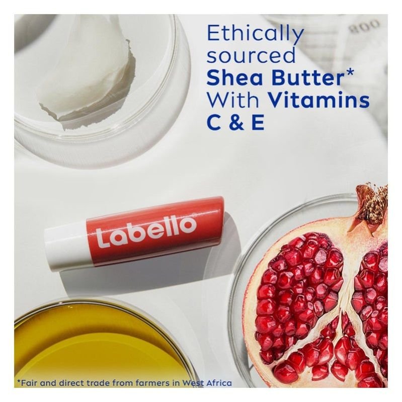 Get long-lasting moisture and pretty-looking lips with Labello Pomegranate Shine Lip Balm. Its rich formula features 24-hour melt-in moisture that not only keeps your lips from drying out but also leaves them feeling smooth and supple all day. The delicious fruity pomegranate aroma delivers a touch of reddish shine to leave your lips looking soft, glossy, and pretty. Enriched with skin-loving ingredients like shea butter and natural oils infused with vitamins, our moisturising lip balm instantly melts into lips, leaving them sensationally soft and effectively protected against cold, wind, and dry air. Dermatologically approved and suitable for all skin types, this long-lasting lip balm glides evenly and easily, so you don’t need to depend on a mirror for every application. Crafted with nothing but natural ingredients and no mineral oil, it’s the perfect daily lip balm to instantly moisturise your lips and leave them looking soft, smooth, and shiny with a hint of reddish shine. 97% of women confirmed that this tinted lip balm beautified their lips. From Cherry and Peach to Strawberry and Aloe Vera, Labello Lip Balm comes in other fun and exciting aromas that deliver perfectly shiny and moisturised lips.