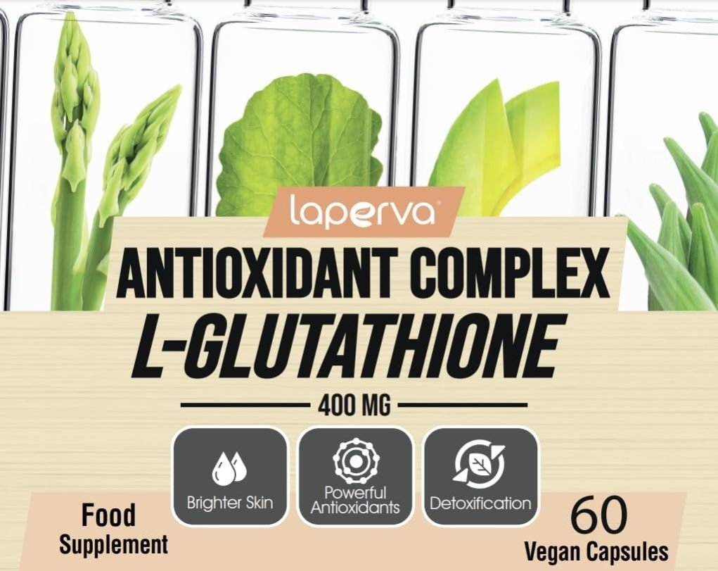 Laperva Antioxidant Complex L Glutathione is a vegan, gluten-free, and natural antioxidant that combats aging, enhances skin, restores brightness, promotes healthy nails, and supports liver detoxification.