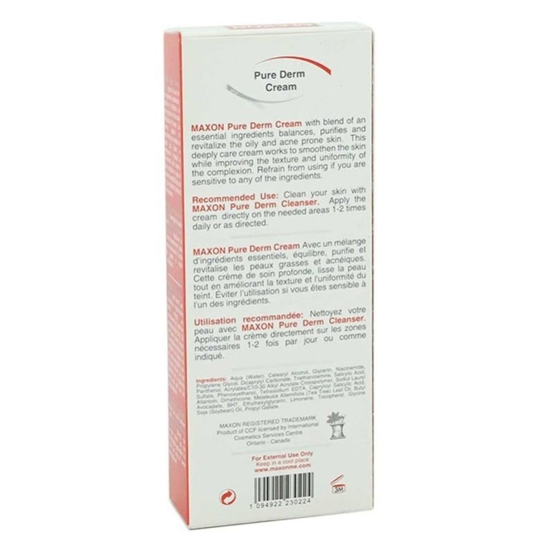 Maxon Pure Derm Cream transforms acne-prone skin fast. This is a beauty weapon against oily and blemish-prone skin. This deep-cleansing cream clears pores, soothes skin, and reduces shine. Bid farewell to acne and use this targeted treatment to reveal the clear, revitalized complexion you deserve. It contains acne-fighting ingredients, including tea tree oil and salicylic acid. It is free from colorants and fragrances. The healthy way to repair and even reverse skin damage.