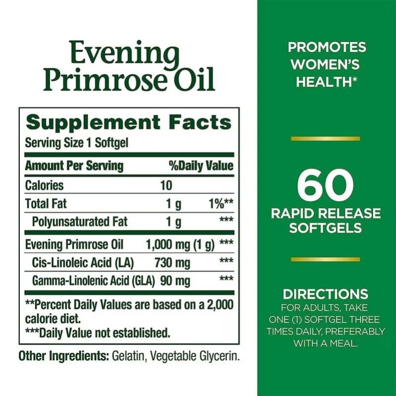 Nature s Bounty Evening Primrose Oil 1000 mg Softgel is a natural source of the unsaturated fatty acid, Gamma-Linolenic Acid (GLA), that promotes women s health. Nature s Bounty s Evening Primrose Oil assures quality, reliability, and purity.