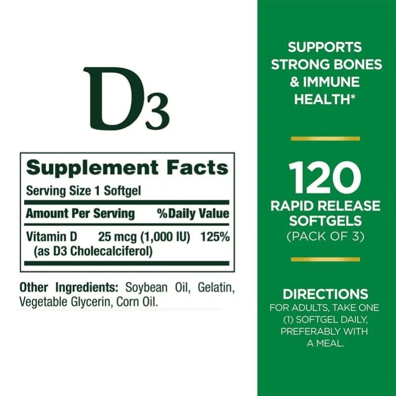 Vitamin D - the Sunshine Vitamin is an essential nutrient that the body creates by converting cholesterol in the body via sunshine. However, today s culture of cubicles, sunscreen, and near-round-the-clock indoor living minimizes our exposure to natural sunlight for the needed period of time for sufficient Vitamin D to form. Supplementing with Nature s Bounty Vitamin D3 is an easy way to increase your daily intake of this important nutrient.