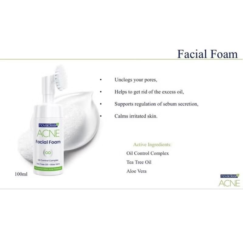 - Pump some Novaclear Acne Oil Control Facial Foam Cleanser on your skin and massage gently with the brush over the face and neck. The brush cleans the skin very thoroughly. Rinse with lukewarm water.