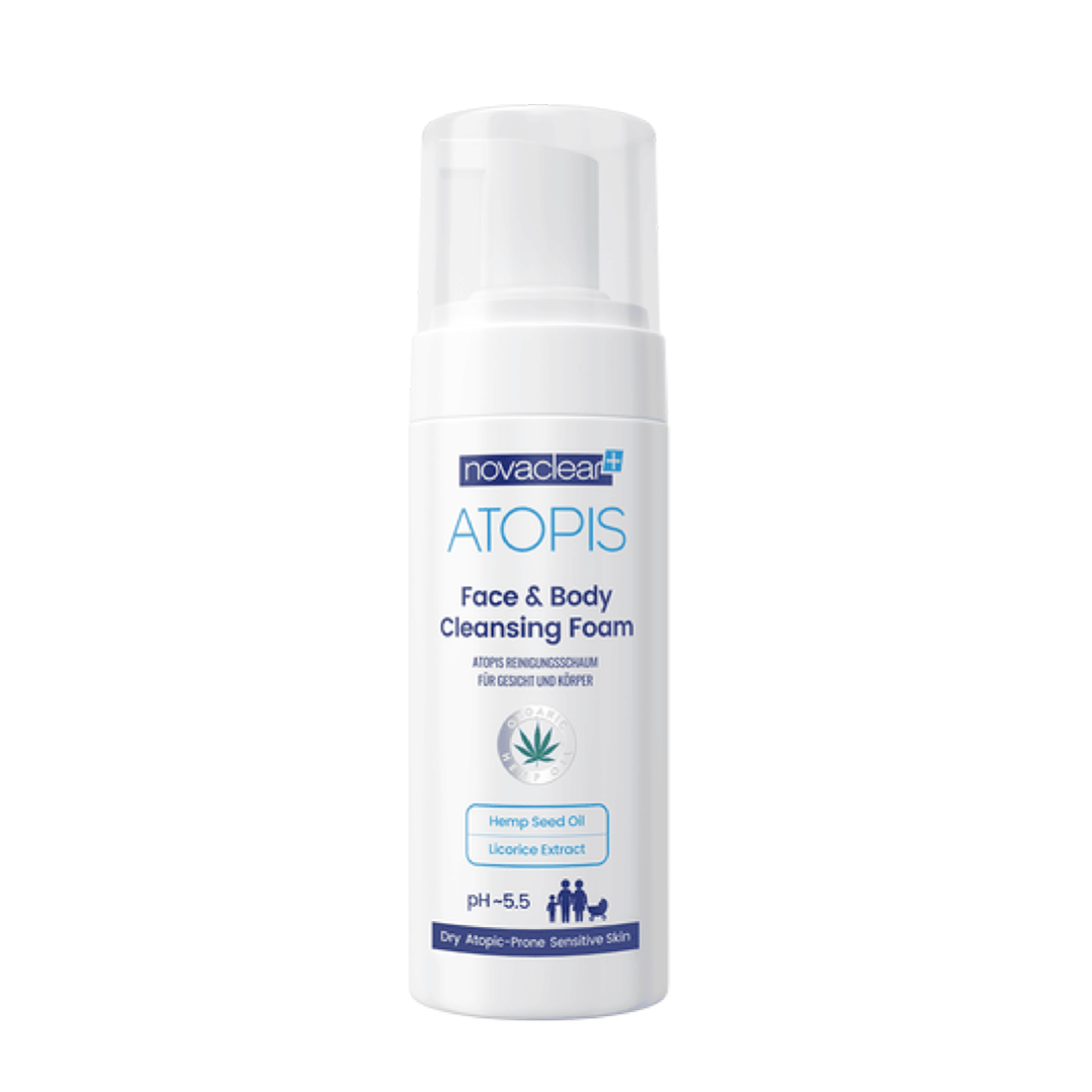 Novaclear Atopis Face & Body Cleansing Foam is a replenishing solution enriched with Certified Hemp Oil and Licorice Root Extract. It is formulated to address skin dryness and roughness. This cleansing foam offers a soothing effect while maintaining optimal hydration levels.