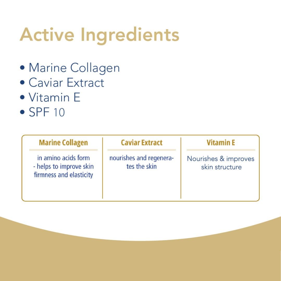 Nourishing Ingredients: Caviar Extract nourishes the skin with minerals and offers antioxidant benefits.