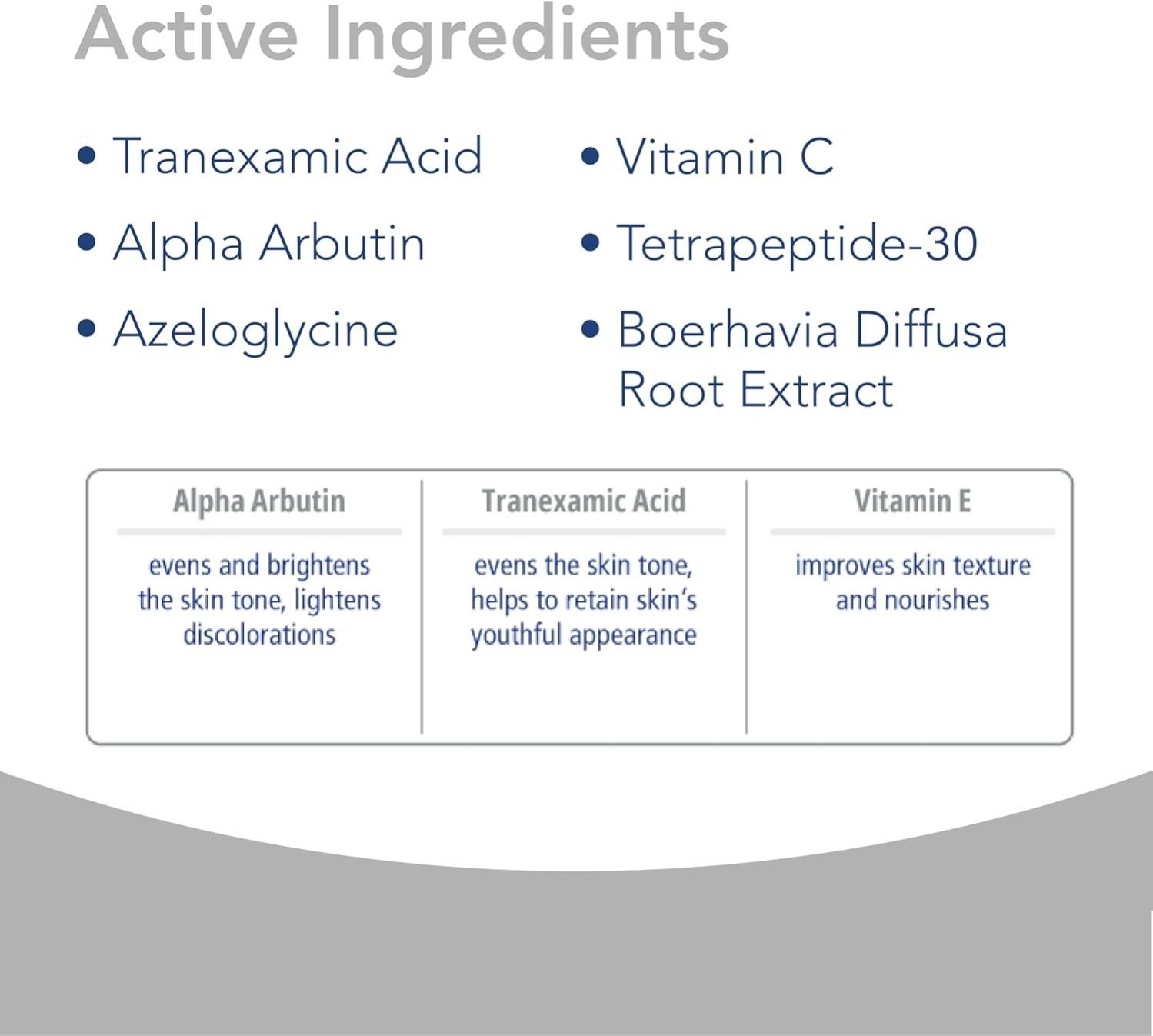 This item contains ingredients like tranexamic acid, alpha arbutin, azelaic acid, vitamin C, and tetrapeptide-30 to reduce hyperpigmentation, lighten dark spots, regulate sebum, and slow aging.
