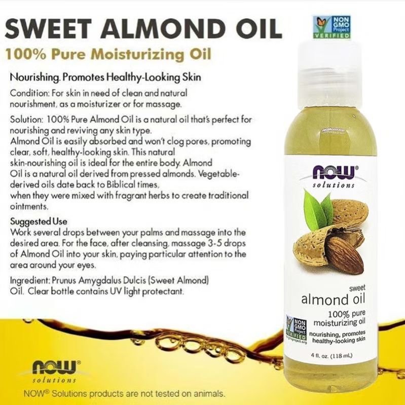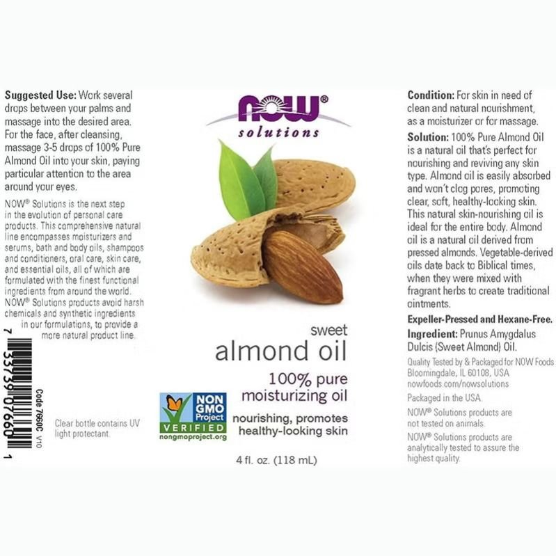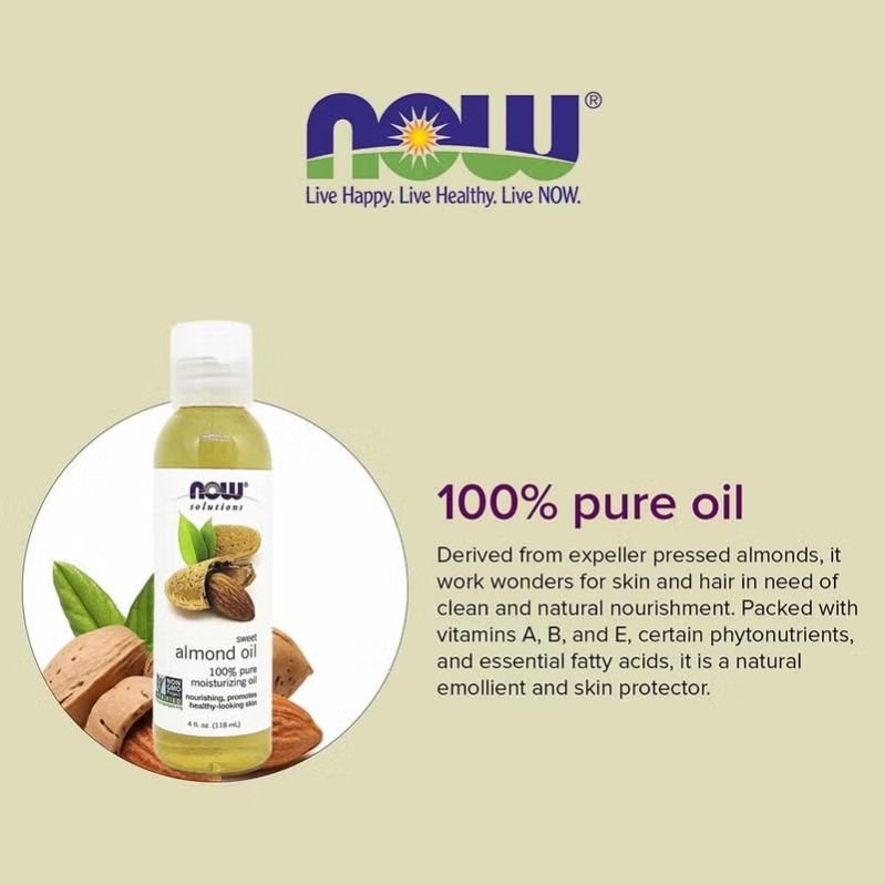 Now Solutions 100% Pure Sweet Almond Moisturising Oil is derived from pressed almonds and is perfect for nourishing and reviving most skin types. Sweet almond oil contains many nutrients that are good for the skin, including vitamins, minerals, fatty acids, and antioxidants. Using almond oil may help soothe and hydrate your skin and hair. Almond oil is rich in vitamin D, vitamin E (tocopherol), and various minerals that help soothe the skin from irritation, protect the skin from UV radiation damage, restore the skin’s moisture barrier, reduce the signs of ageing, and fade scars. It is easily absorbed and won’t clog pores, promoting clear, soft, healthy-looking skin. This skin-nourishing oil is ideal for the entire body and is a great base oil for carrying essential oils topically. Now sweet almond oil is 100% pure moisturising oil. This natural skin-nourishing oil is ideal for the entire body. Vegetable-derived oils date back to Biblical times, when they were mixed with fragrant herbs to create traditional ointments. In general, Now Sweet Almond Moisturising Oil is suitable for anyone with skin in need of calming and hydration.