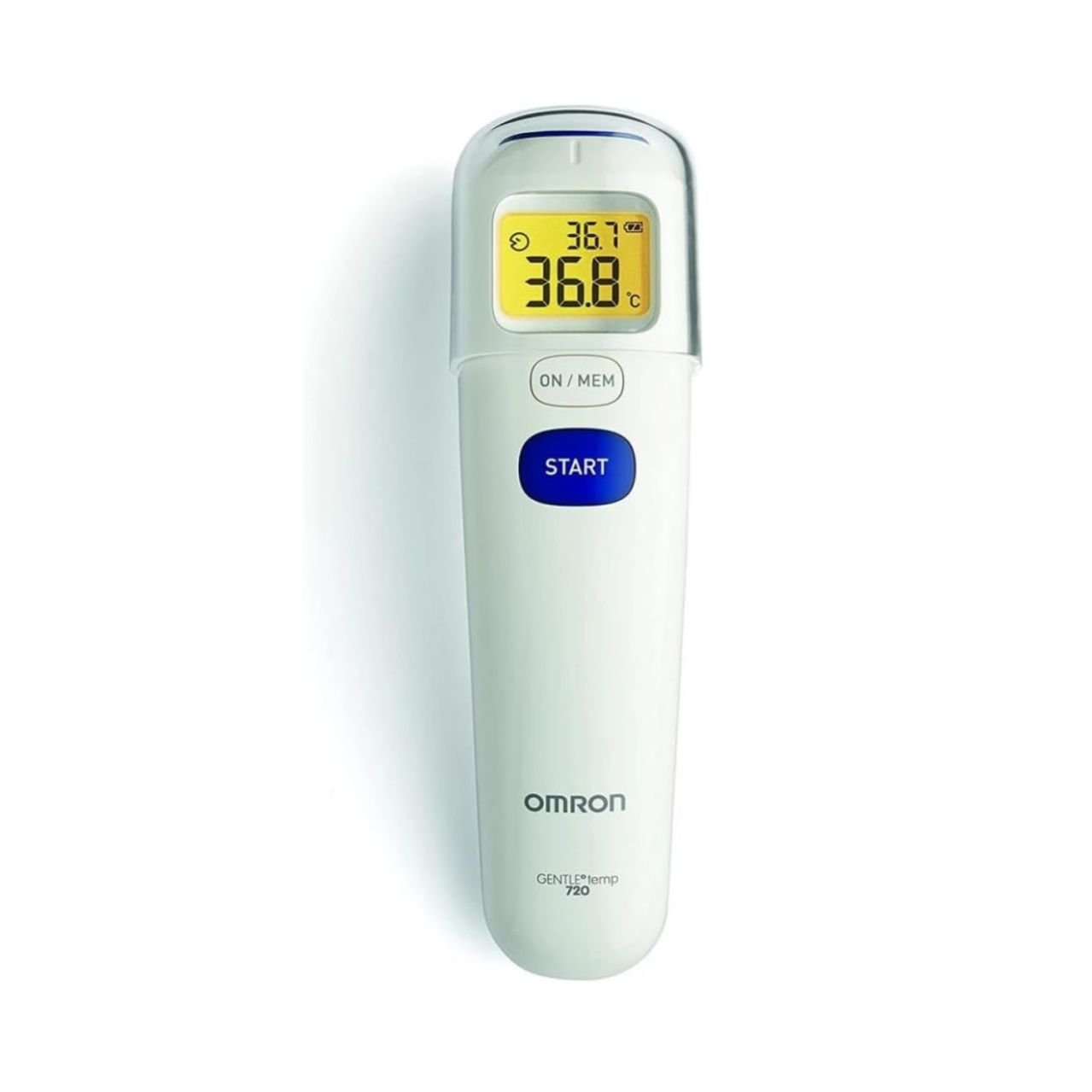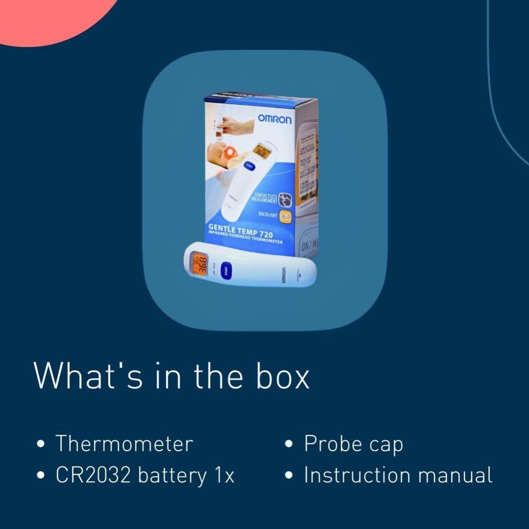 Omron Healthcare, Headquartered in Kyoto, Japan, is a global leader in the field of clinically proven, innovative medical equipment for health monitoring and therapy. As a brand, Omron believes in Zero compromise on healthier lives; it is the goal that powers and inspires Omron Healthcare s innovations and helps people compromise less and achieve more in life. As a result of its proven track record, OMRON is today the Number 1 recommended brand by Doctors, cardiologists and Health Professionals across the world when recommending thermometers, blood pressure monitors or nebulizer machines to their patients. The OMRON Gentle Temp 720 is our first digital forehead thermometer. Using highly accurate technology to measure the temperature of a forehead, surface or room, it s hygienic, comfortable and very fast. The Gentle Temp 720 activates at the touch of a button; just hold the sensor 1-3 cm away from the surface you wish to measure, press the start button, and you get a reading in just one second. To make nighttimereadings easier, the Gentle Temp 720 has a backlight function so you can take a reading at night whilst your child is sleeping. With a memory capable of recording up to 25 readings, it s possible to track temperature changes over time and monitor trends. Features At a Glance:• Contactless measurement • 3-in-1 measurement (ear, surface, room temperature) • Fast 1-second measurement • Selectable Celsius/Fahrenheit • Large display • Night mode—background lighting and mute function • Automatic shut-off Set Contains: 720 Digital Thermometer Batteries Lithium CR2032 Instruction manual